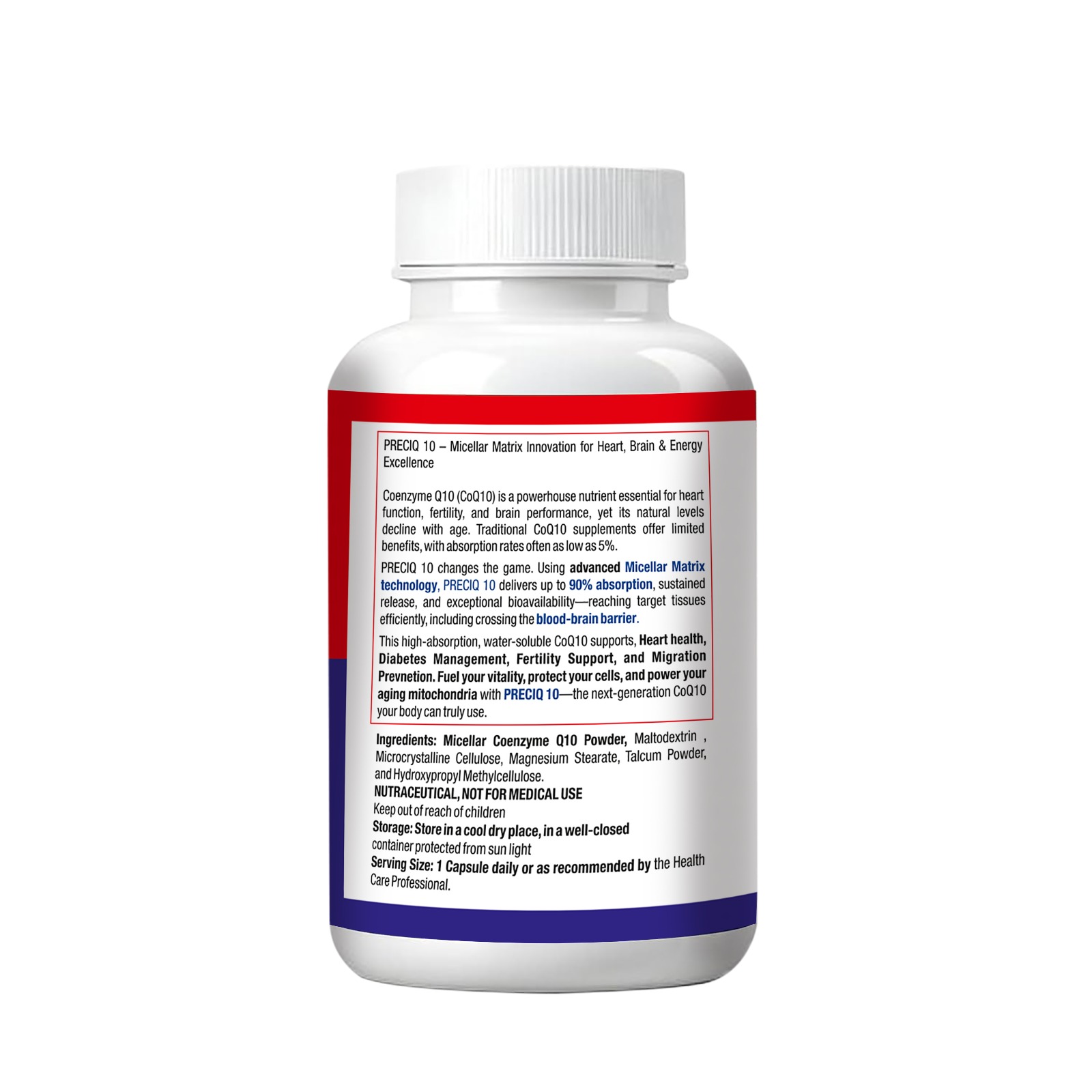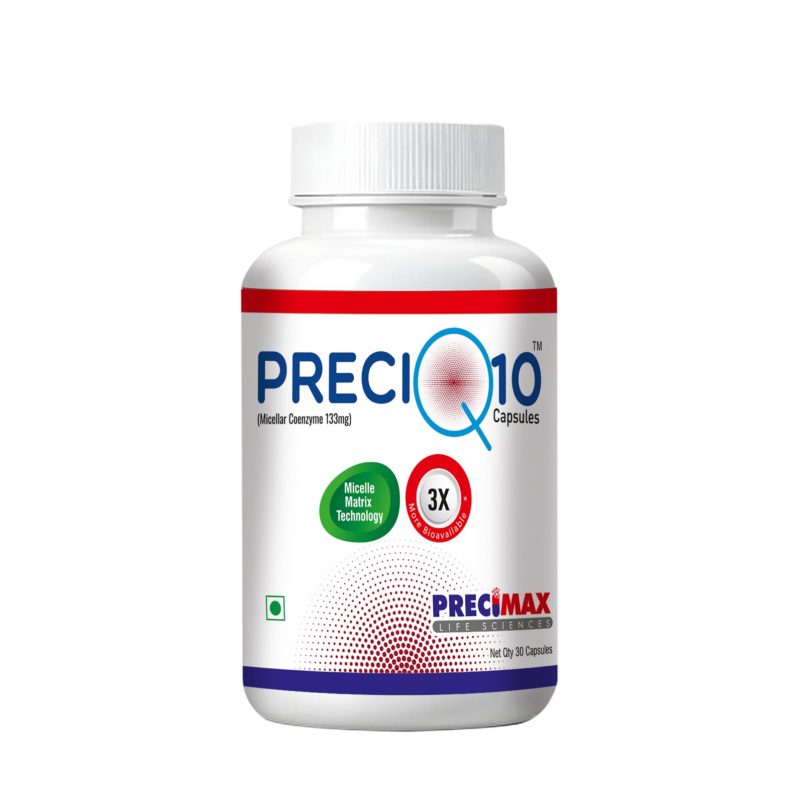 PreciQ uses micellar matrix technology, which provides 3–4 times better bioavailability and superior absorption compared to standard CoQ10 supplements.