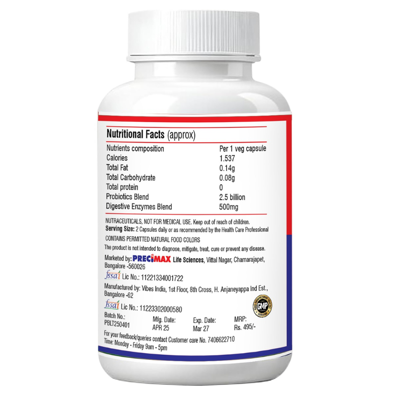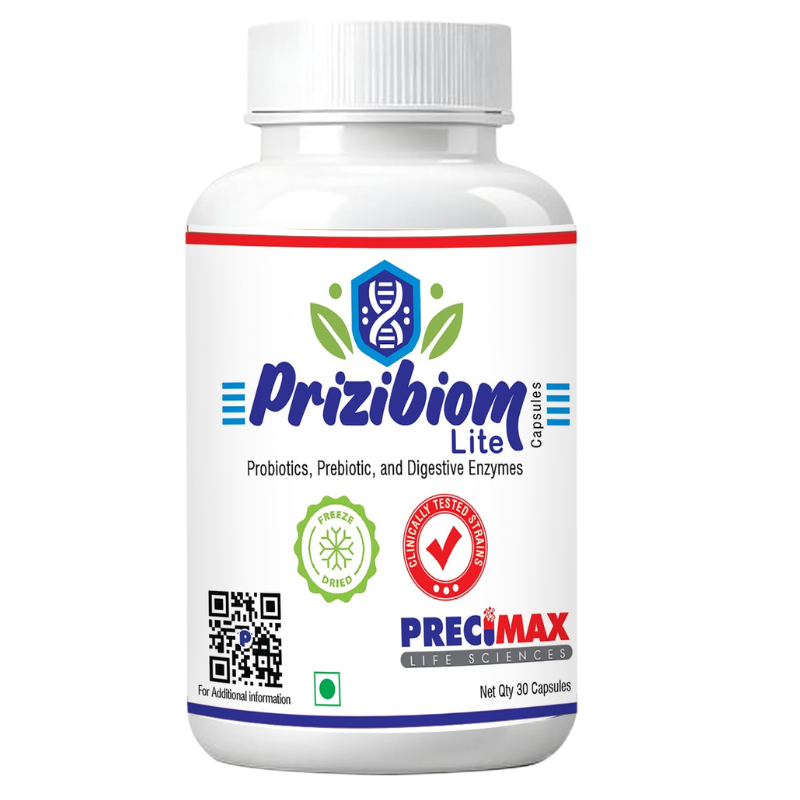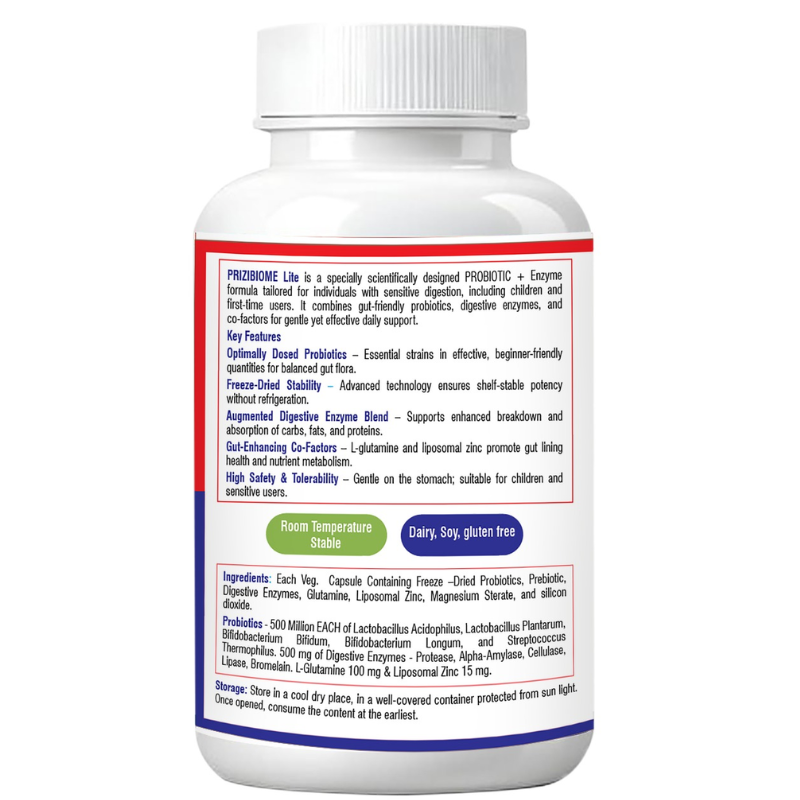 Prizibiom® Lite works on a 3-pillar gut support approach with Probiotics (2.5 Billion CFU) to restore healthy gut bacteria, Prebiotics to nourish and strengthen them, and Digestive Enzymes to support efficient breakdown of proteins, fats, carbohydrates, and fibers.