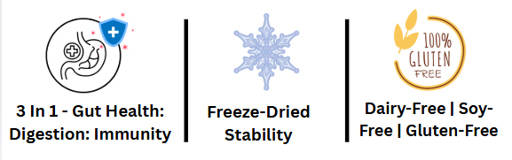 It provides a balanced dose of freeze-dried probiotics, essential prebiotics, digestive enzymes, and gut-supporting nutrients to promote comfortable digestion, better nutrient breakdown, and daily gut balance — without overwhelming sensitive stomachs.