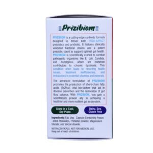 By supplying diverse beneficial bacteria along with a prebiotic that nourishes them, Prizibiom helps repopulate the gut with healthy microbes and rebalance the microbial ecosystem disrupted by illness, diet, or medications.