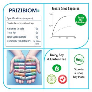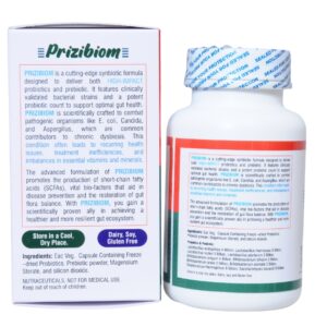 Prizibiom works through multiple complementary pathways—enhancing gut barrier integrity, suppressing inflammation, producing short-chain fatty acids, and improving microbial diversity. This leads to better digestion, reduced bloating, and improved bowel regularity, while also boosting insulin sensitivity, vitamin synthesis, and nutrient absorption. Additionally, Prizibiom helps prevent overgrowth of harmful bacteria and yeast, supports immune function, and plays a supportive role in managing PCOS, IBS/IBD, chronic allergies, SIBO, and metabolic conditions. Its vegetarian capsules are easy to use (1–2 per day), making it a safe.